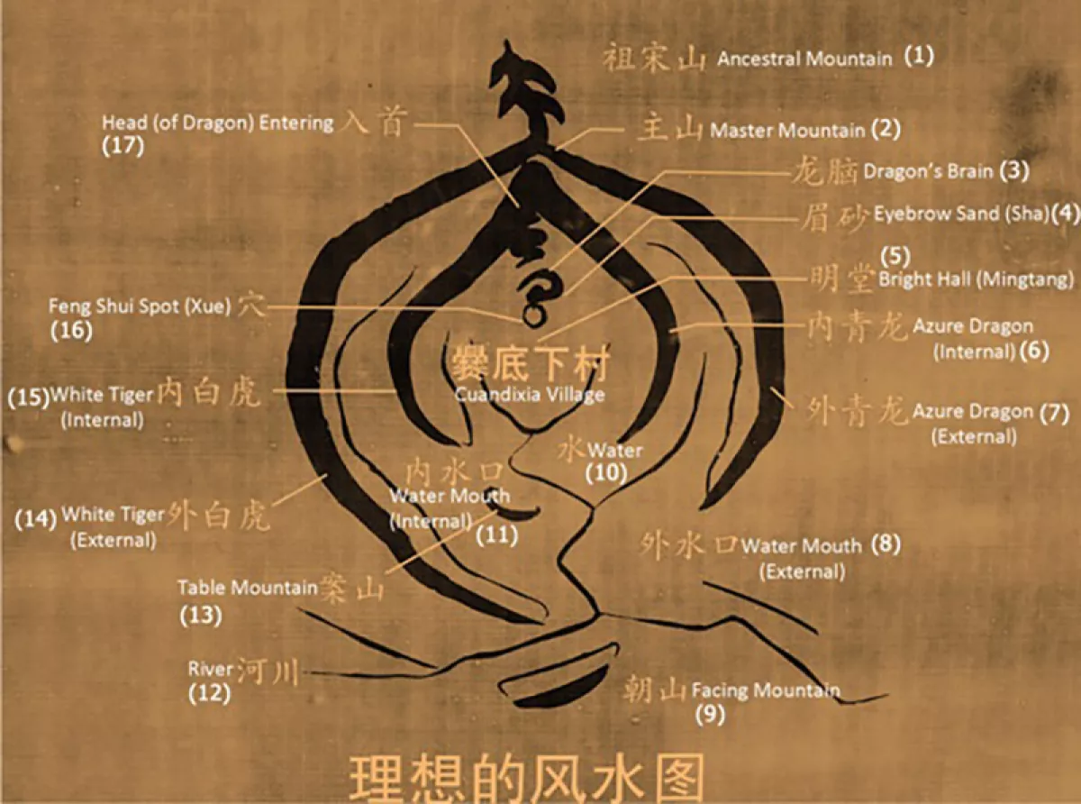 Чтобы выразить гармонию между людьми и окружающим их красивым ландшафтом, конфигурациям ландшафта вокруг деревни были даны одушевлённые имена – «притаившийся тигр», «летучая мышь, приносящая удачу», «золотая жаба», «подставка для кистей» и т.д. В традиционной китайской культуре всегда относились к природе как к живому существу, магическому и одушевленному.