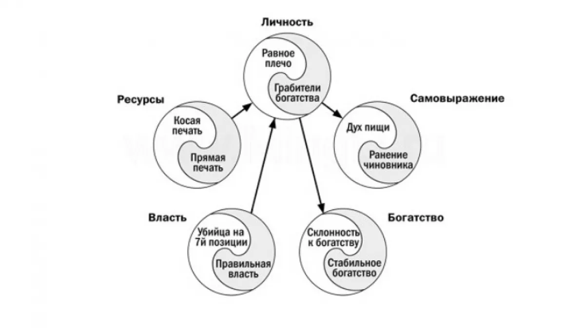 10. 正印 (zheng yin) – элемент, порождающий элемент личности, противоположный по полярности (Иньская Вода) – разнородный ресурс, прямая печать, истинная/правильная печать, условные идеи, пристойный ресурс.
