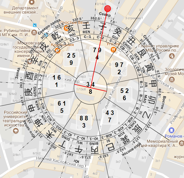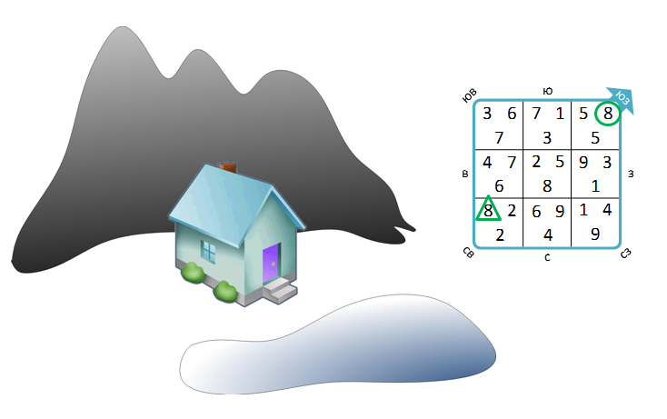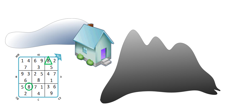 Для расчета карты летящих звезд берется гора фасада. Гора – это 15-ти градусный сектор, всего таких гор – 24. То есть, когда вы измеряете дверь дома, стоя рядом с ней, вам надо определить, в какую гору попал фасад здания.